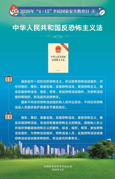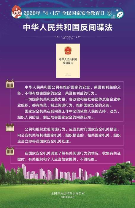 国家安全无小事,国家安危系于每一位公民,4月15日是全民国家安全教育日,让我们一起通过全国普法办编制的2020年全民国家安全教育日法治宣传挂图,学习国家安全知识。