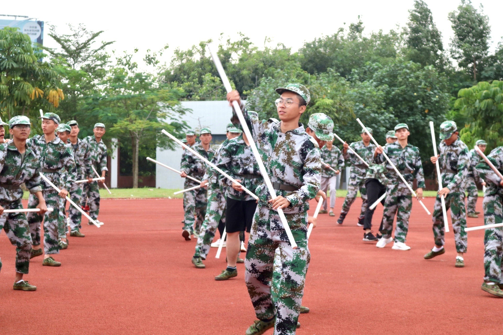学校里一个个迷彩剪影一声声口号呼令终将离你而去那不妨把一帧帧美好的场景定格在今天梦想定会与你仰看穹宇壮阔永望沃野千里