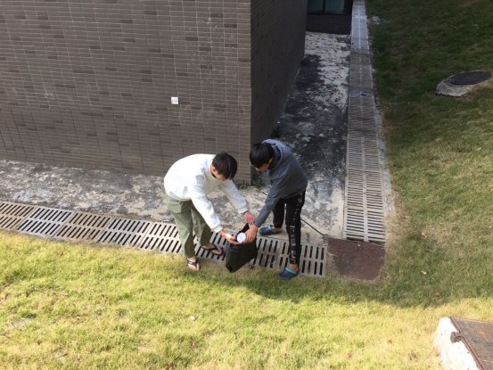 同学们在清理草坪及地上发现的垃圾。